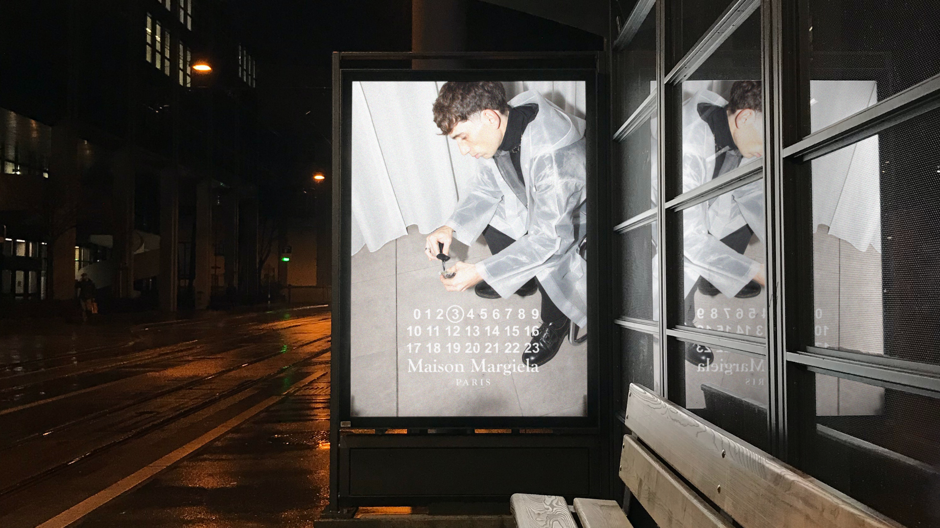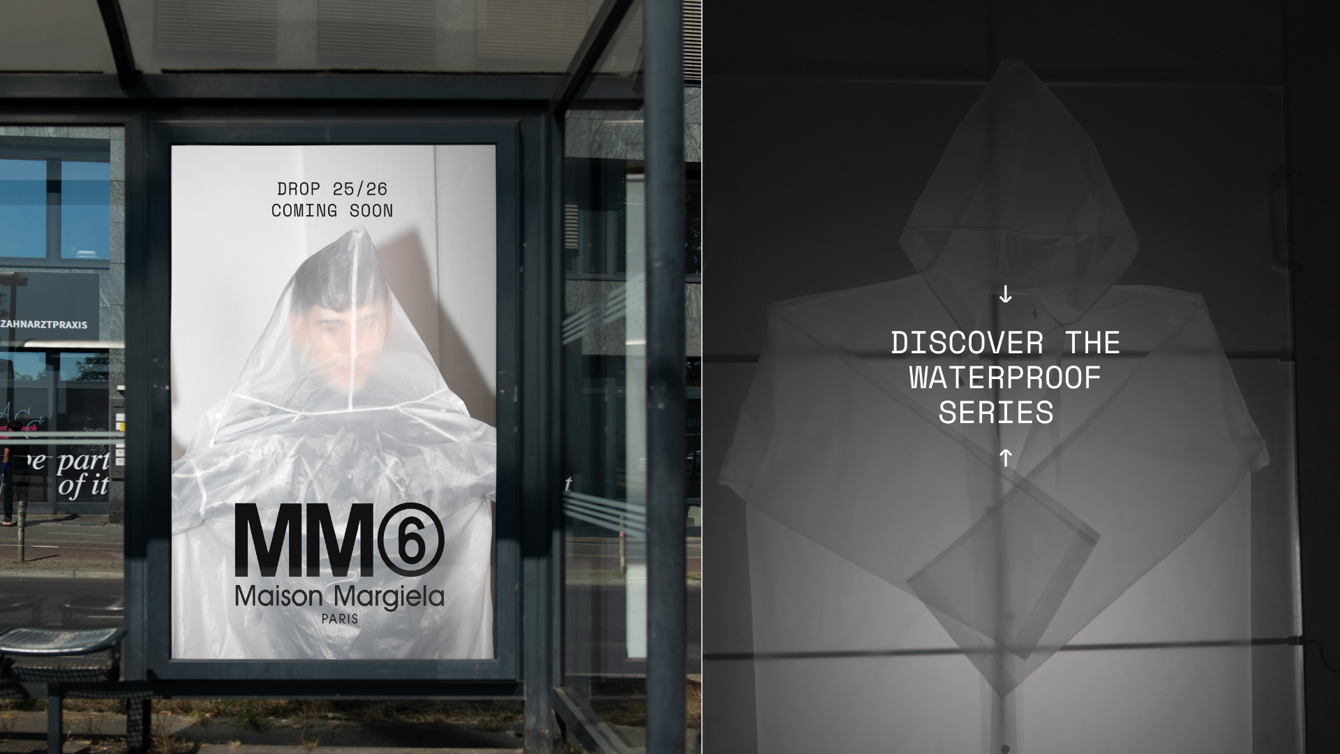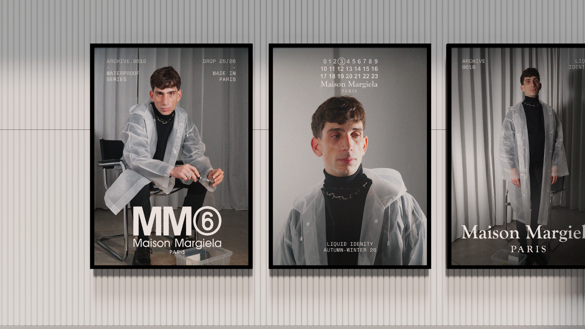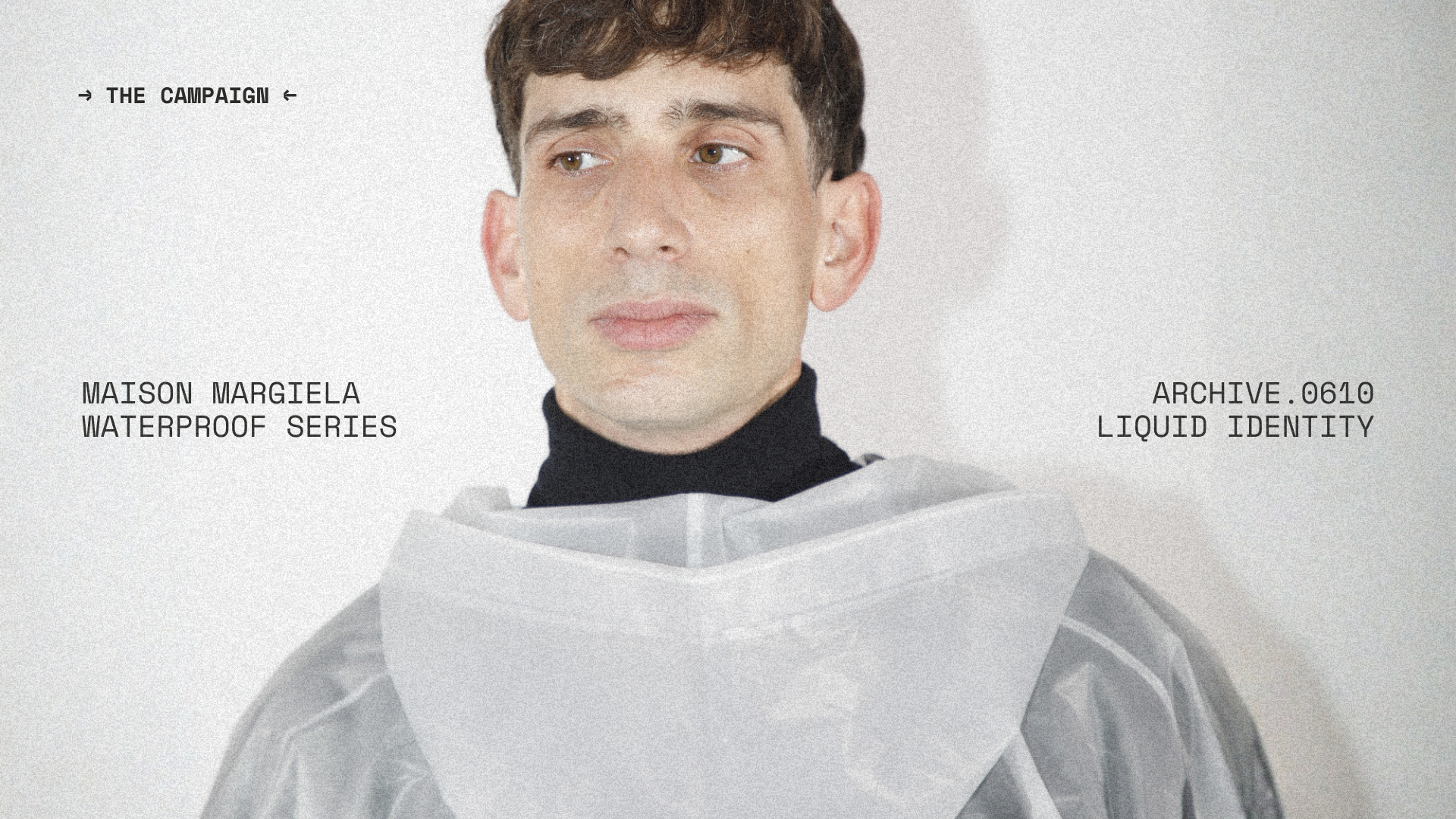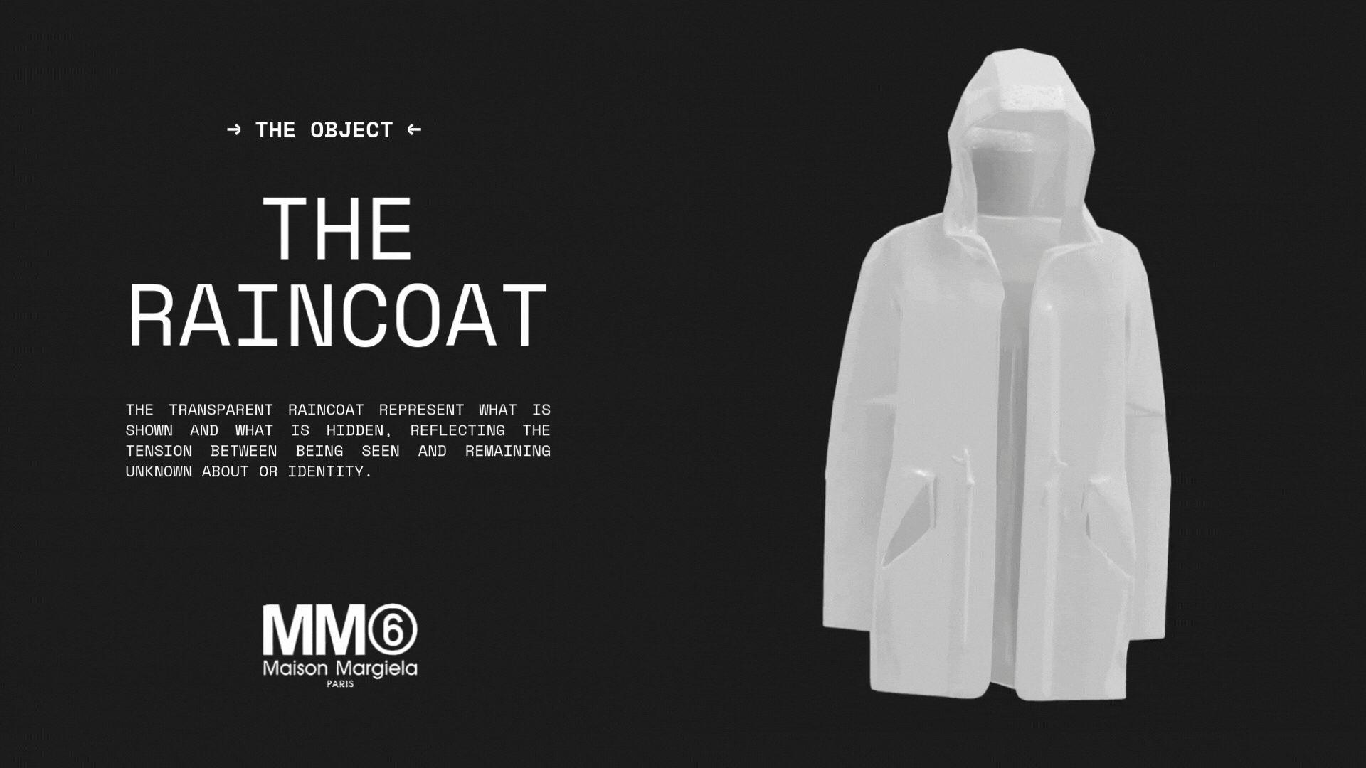 The chosen object was a transparent raincoat. We created an audiovisual piece and graphic visuals that translate the Maison Margiela universe into a new context. The concept explores the constant search for identity and how it changes with time and experience. The transparent raincoat becomes a metaphor: a layer that protects, reveals, and transforms — just like identity itself.